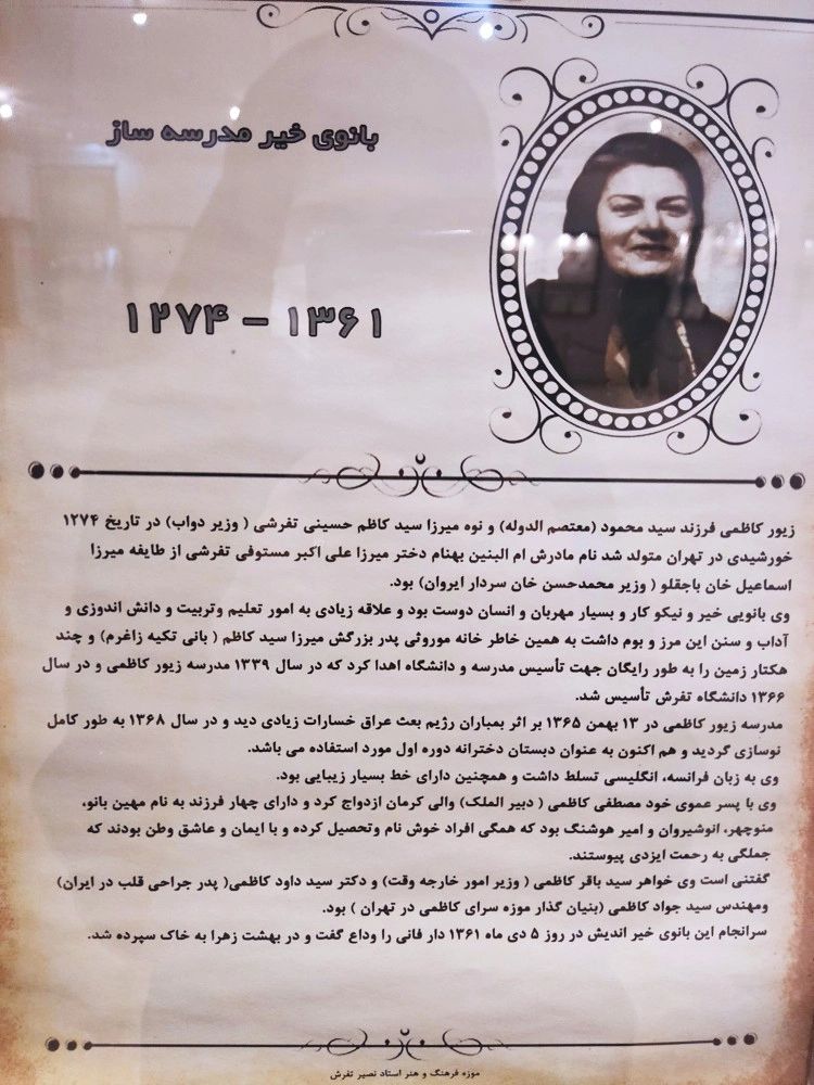 زیور کاظمی فرزند سیّد محمود (معتصم‌الدوله) و نوه میرزا سیّد کاظم حسینی تفرشی (وزیر دواب)، در سال ۱۲۷۴ خورشیدی در تهران دیده به جهان گشودند. مادر بزرگوارشان خانم ام‌البنین، دختر میرزا علی‌اکبر مستوفی تفرشی از طایفه میرزا اسماعیل‌خان باجعقلو (وزیر محمّدحسین‌خان سردار ایروان) بودند. این بانوی خیّر و نیکوکار که انسانی بسیار مهربان و مردم‌دوست بودند، علاقه وافری به امور تعلیم‌وتربیت و پاسداشت آداب و سنن این مرزوبوم داشتند. بر همین اساس، خانه موروثی پدربزرگشان میرزا سیّد کاظم (بانی تکیه زاغرم) و چندین هکتار زمین را به‌طور رایگان جهت توسعه فضاهای آموزشی اهدا نمودند. ثمره این اقدام خداپسندانه، تأسیس «مدرسه زیور کاظمی» در سال ۱۳۳۹ و «دانشگاه تفرش» در سال ۱۳۶۶ بود.